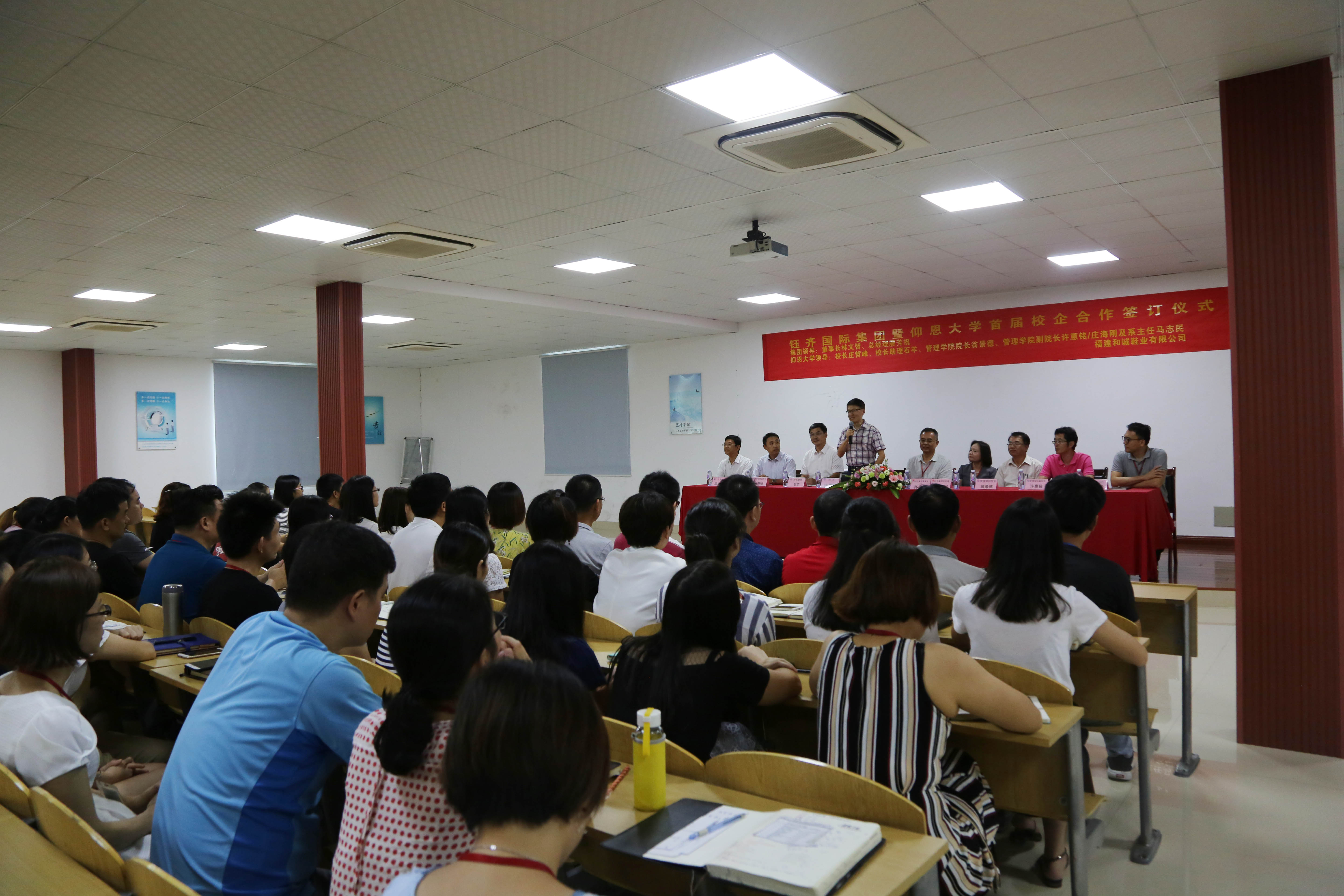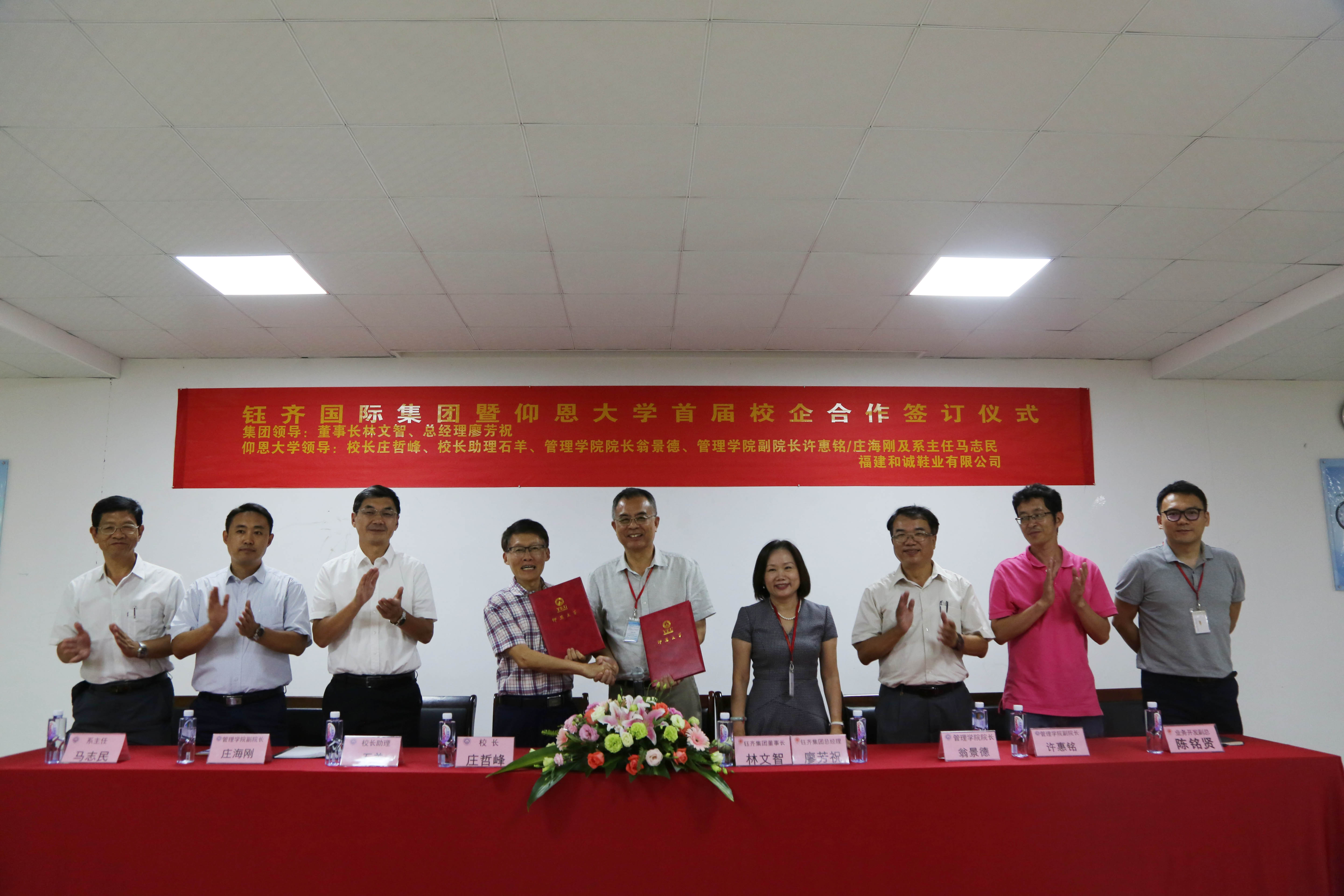 9月19日下午,校党委书记庄哲峰,校长助理石羊,开云kaiyun官方网站院长翁景德,开云kaiyun官方网站副院长许惠铭、庄海刚及系主任马志民一行前往福建和诚鞋业有限公司参访,并签订校企合作意向书。钰齐集团董事长林文智、总经理廖芳祝,业务开发副总陈铭贤等出席了本次签订仪式。