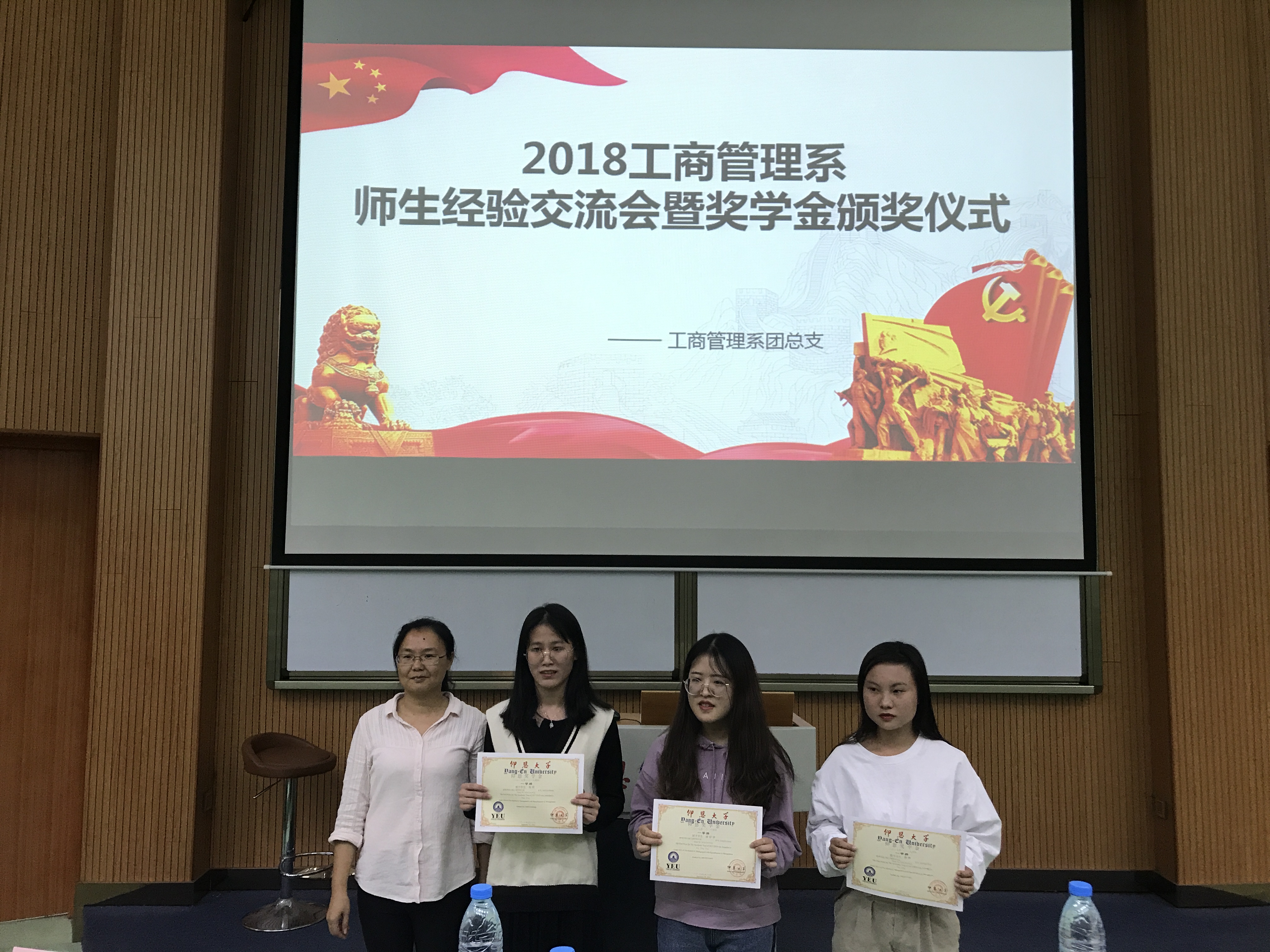 学习经验交流 会上,工商管理系代理主任蒋志丹首先上台致辞,她简要介绍了工商管理系的专业、课程和师资力量建设,以及近年来工商管理专业所取得的成绩。随后进行颁奖仪式,为在2017-2018学年中表现优异荣获吴庆星奖学金、仰恩奖学金以及泉州农行助学奖学金的同学颁发荣誉证书。学习经验交流中,李秀芳、张海莲、傅欣怡、林威、杨娇、颜静等6位奖学金获得者纷纷上台分享经验与感悟,为2018级新生解疑答惑。几位同学就学习、竞赛、工作和社团等方面谈了自身的感受,总结出贵在端正“坚持”、“自省”以及“勤勉”的学习态度,生动诠释了大学生自我管理的重要性。