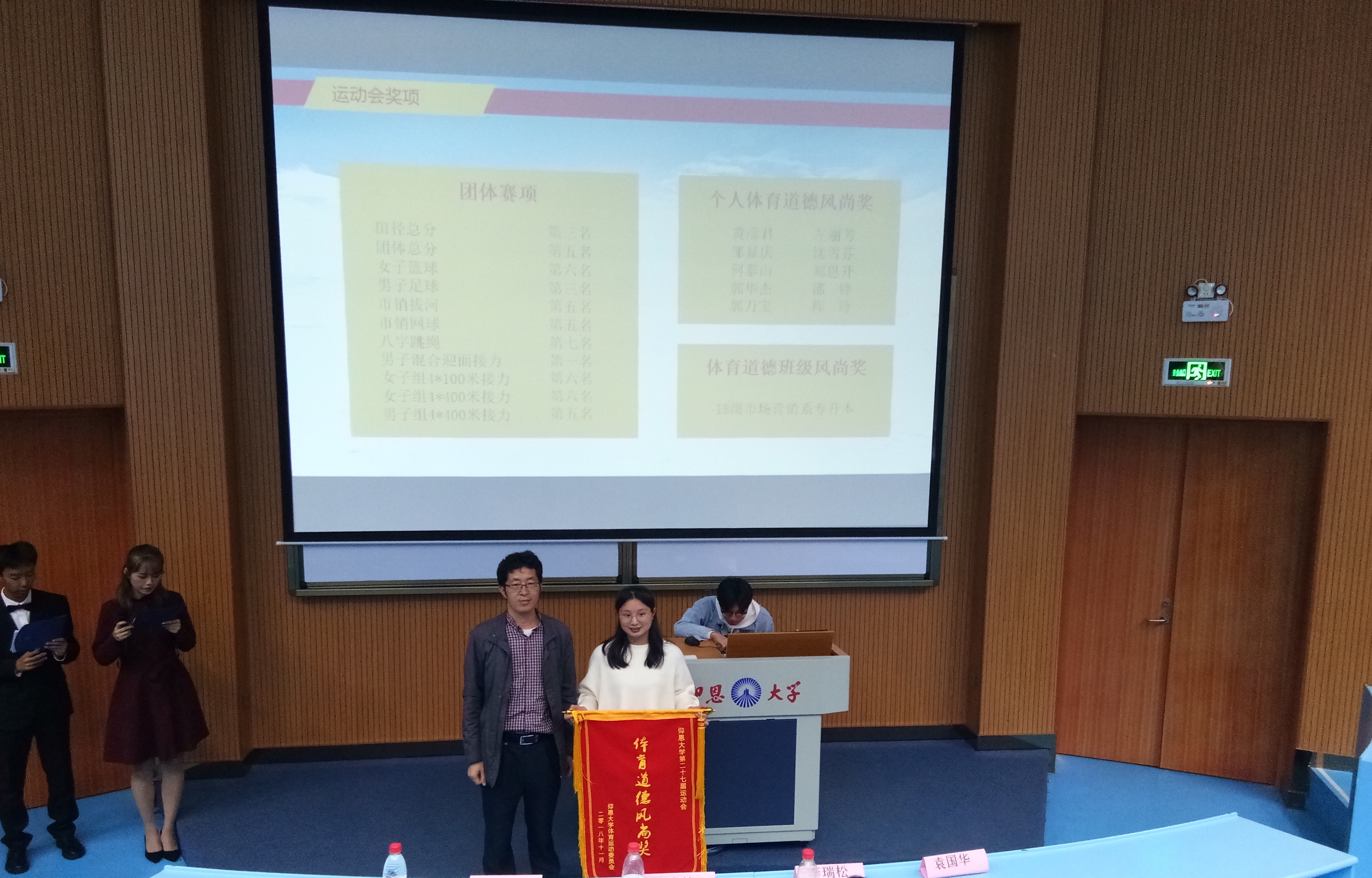 运动会表彰 首先,由系主任李瑞松老师致开场词,宣读大会的基本事项。其次,在送祝福环节中,由高年级学长学姐精心准备礼物,表达对新生的欢迎与温暖。同时,本次大会也对奖学金获得者、三好优干、暑期实践先进个人、运动会先进个人等学生进行颁奖。紧接着,大会进行仰恩一分钟环节,6位优秀的毕业生阐述了心底最深刻的想法;最后,许惠铭老师对本次师生表彰大会作总结讲话,他鼓励新生们积极努力,不断充实自我,本次大会圆满结束。