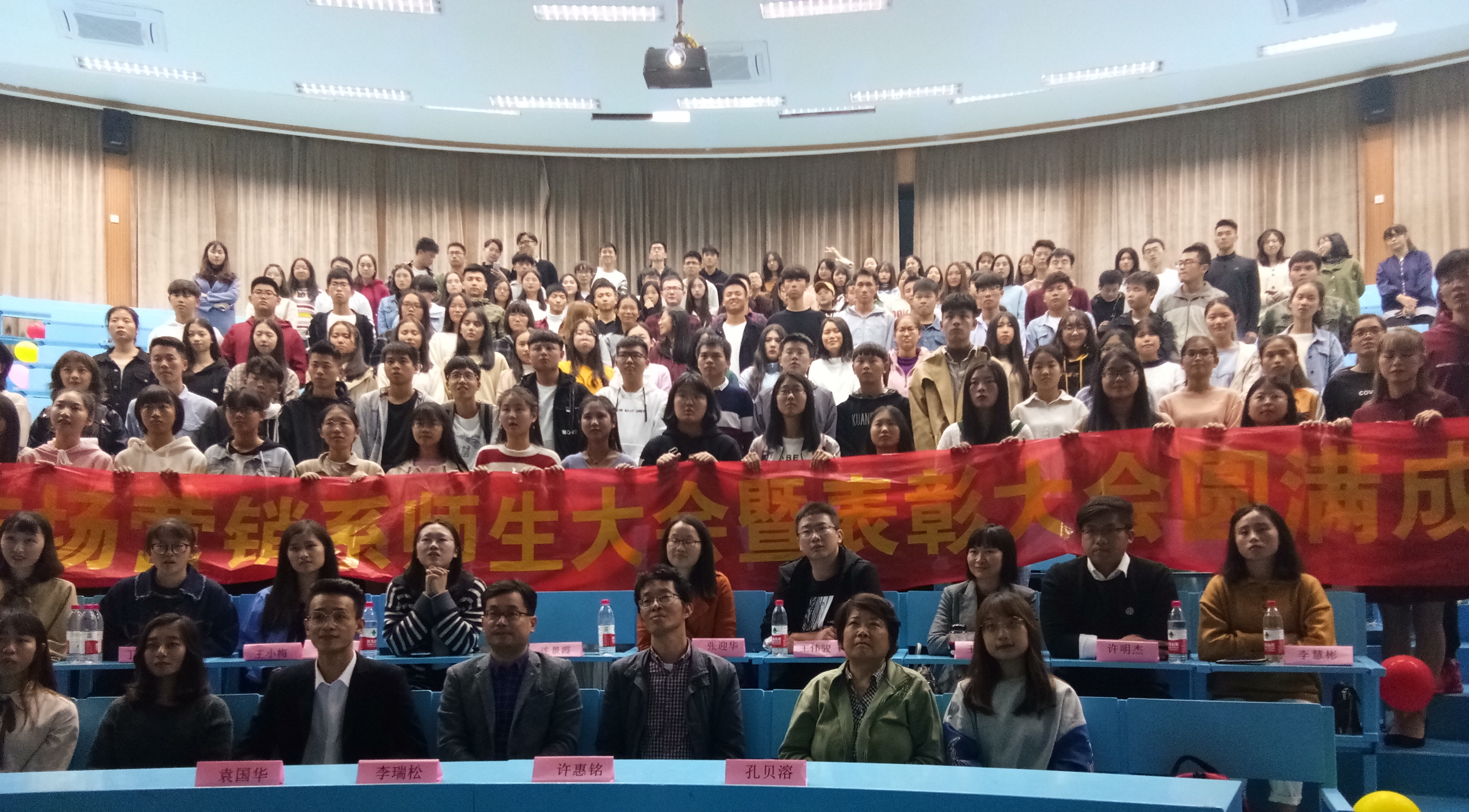 为了不断增强市场营销系的凝聚力,鼓励同学们再接再厉,11月29日晚上,市场营销系于第一教学区和昌教学楼求是讲堂举行师生大会暨表彰大会,开云kaiyun官方网站党总支书记兼常务副院长许惠铭、市场营销系主任李瑞松、全体专任教师和辅导员老师出席大会。