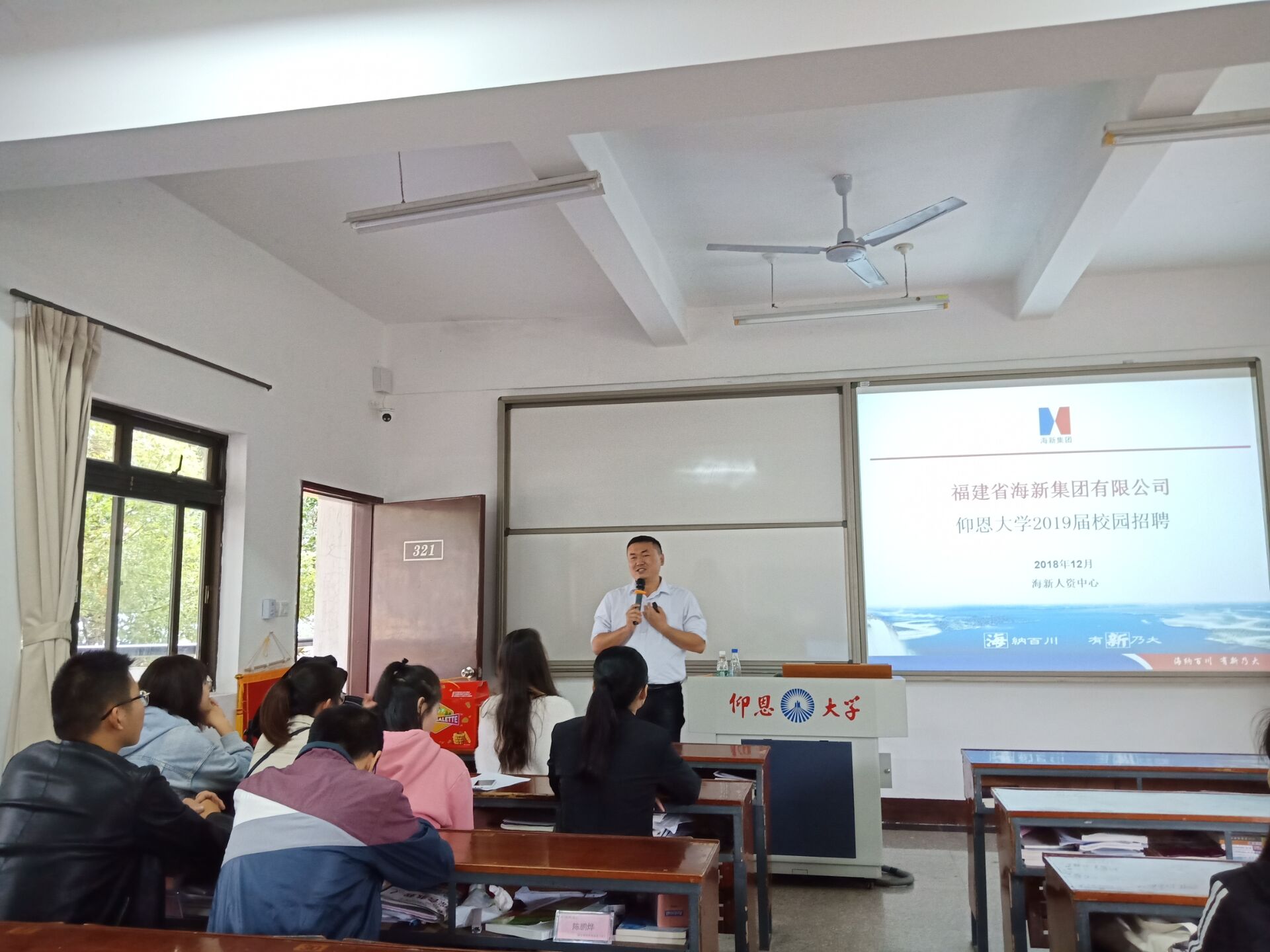 12月5日下午,海新集团2019年校园招聘宣讲会在第一教学区共和楼321举行。此次宣讲会由海新集团招聘主管汤俊杰先生主讲,招聘的岗位有销售代表、会计、出纳、稽核专员、技术储干、生产储干等。