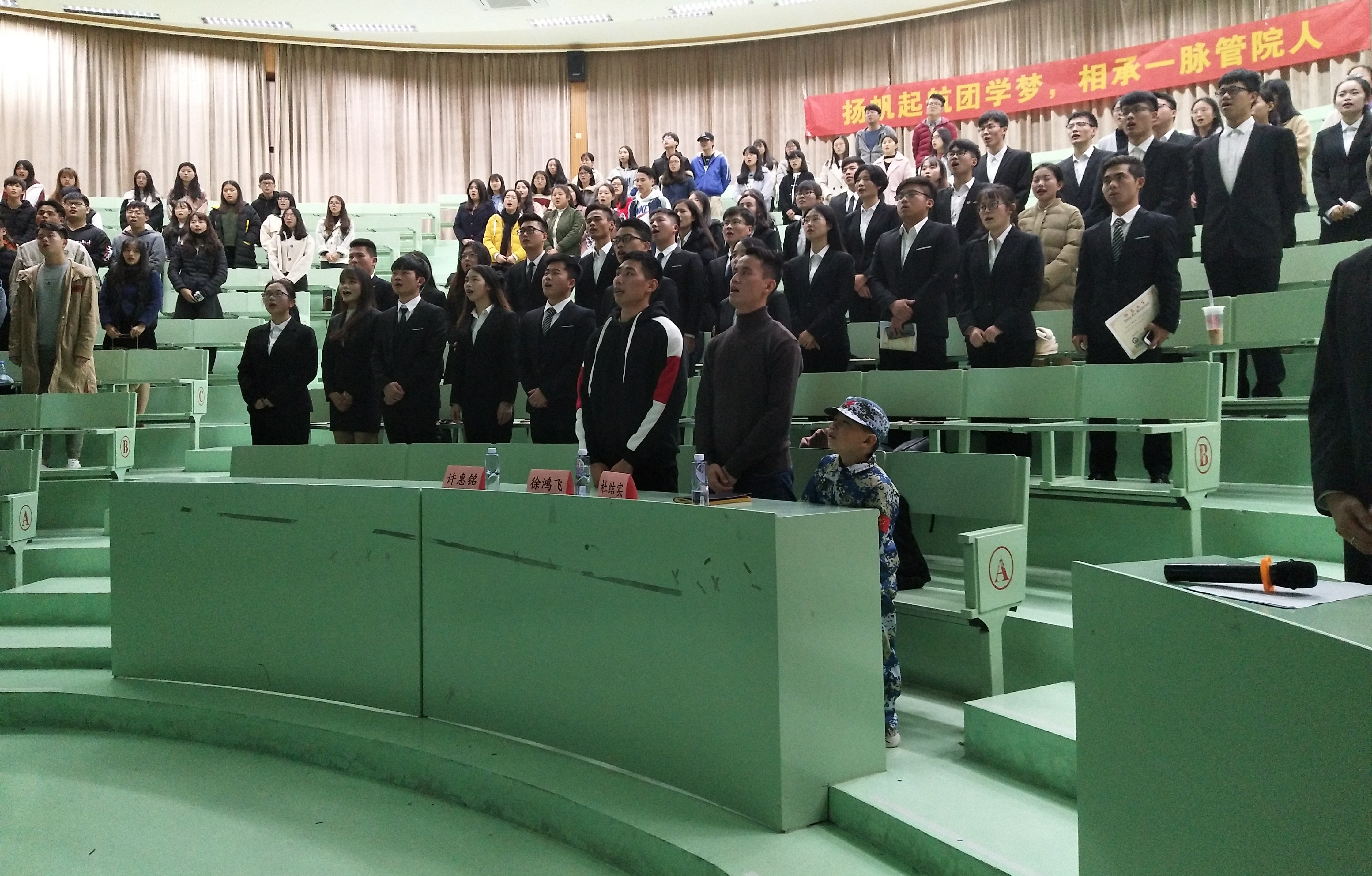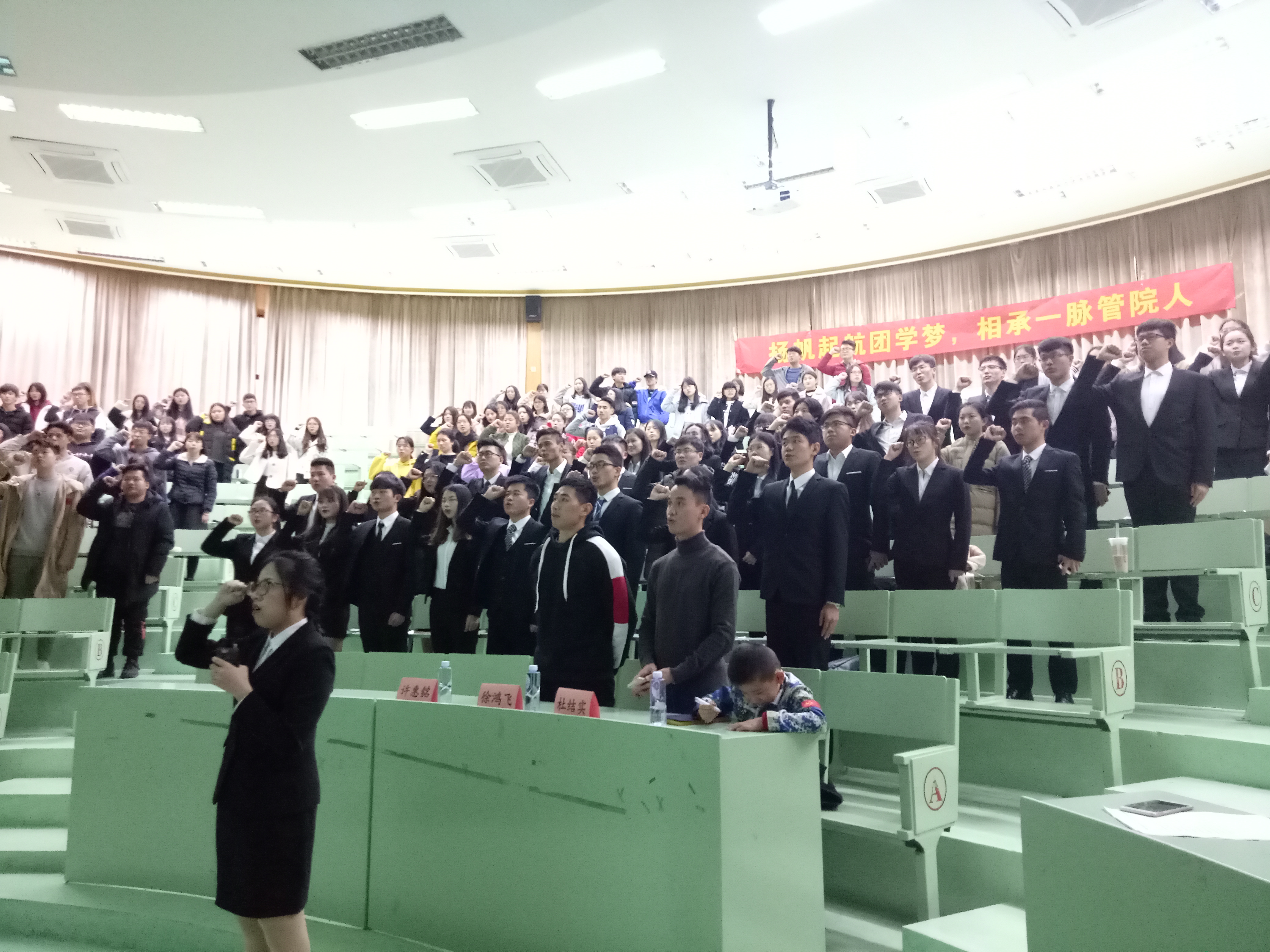 全体干部就职宣誓 交接大会以全体成员奏唱国歌拉开序幕,紧接着由上一任院团委学生副书记苏雅雅、院学生会主席周家为做述职工作报告。团学第二十一届代理干部就职演说时,新干部不仅表达了自己的工作设想,也表明了其创造性开展工作并顺利完成任务的决心。