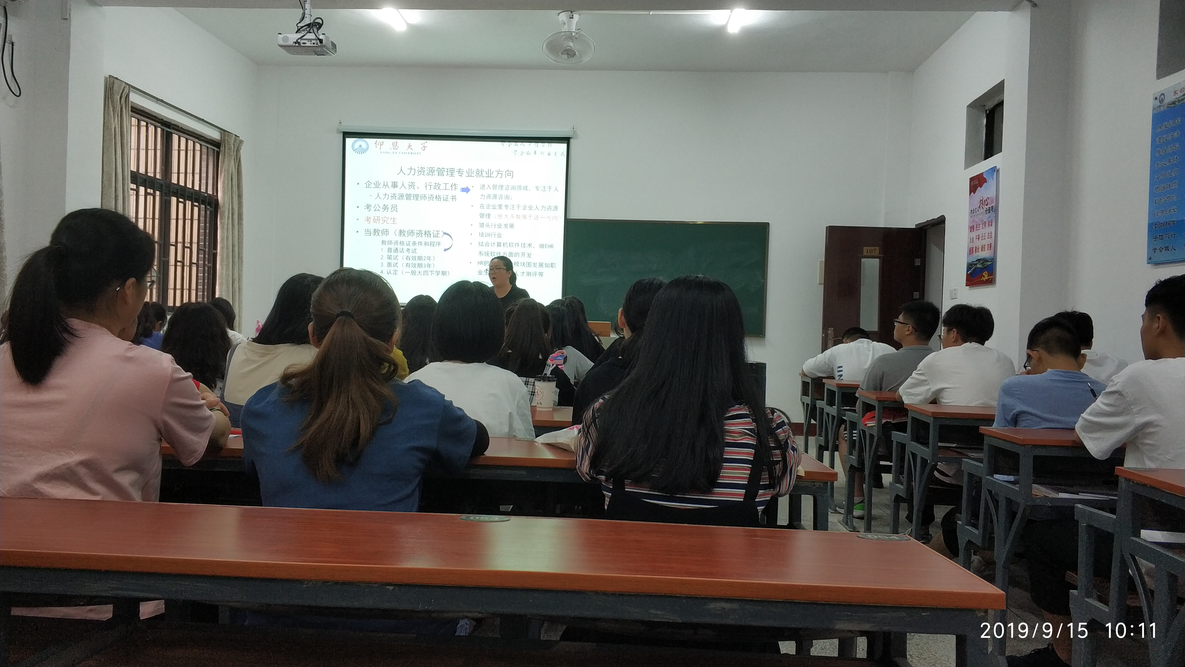 刘清老师主讲 专业教育会上,刘清老师从四个方面展开说明介绍:一是介绍学校的发展历程;二是讲述人力资源管理专业课程概况;三是讲解人力资源管理专业的发展前景;四是对新生进行思想教育。为避免新生思想疲倦,专业教育还加入其他方面的学习和交流,专业教育节奏紧凑,张弛有度。