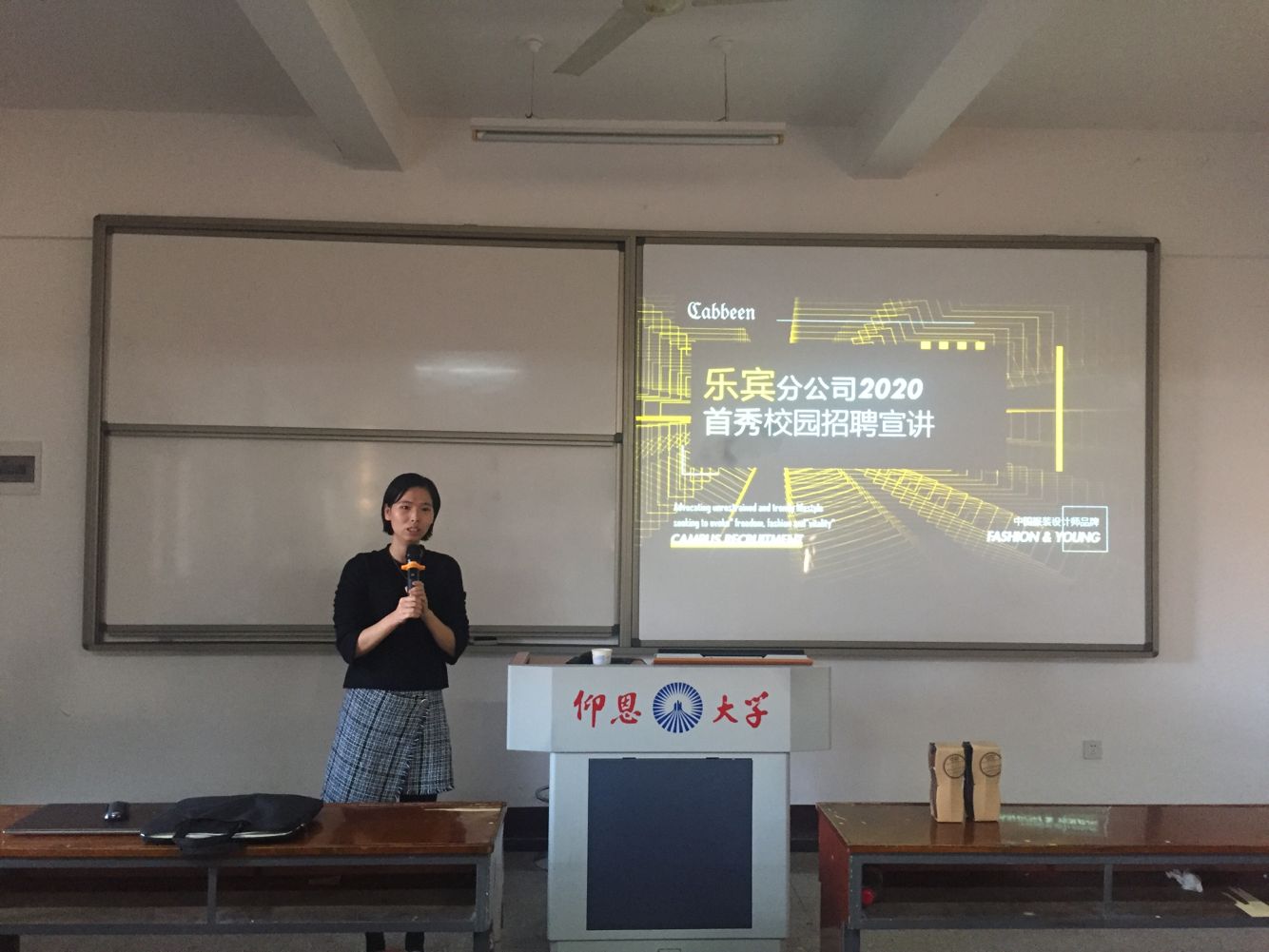 杨丽娟宣讲 此次宣讲会邀请了卡宾分公司乐宾副总杨丽娟和卡宾分公司培训师江帆到现场进行宣讲招聘。会上,江帆从卡宾服饰的简介、福利及招聘岗位展开介绍,并与到场的应届毕业生进行互动,杨经理则分享了自身的工作经历与感慨。最后,同学们积极参与,杨经理和培训师江帆耐心解答同学们的提问,现场氛围活跃。