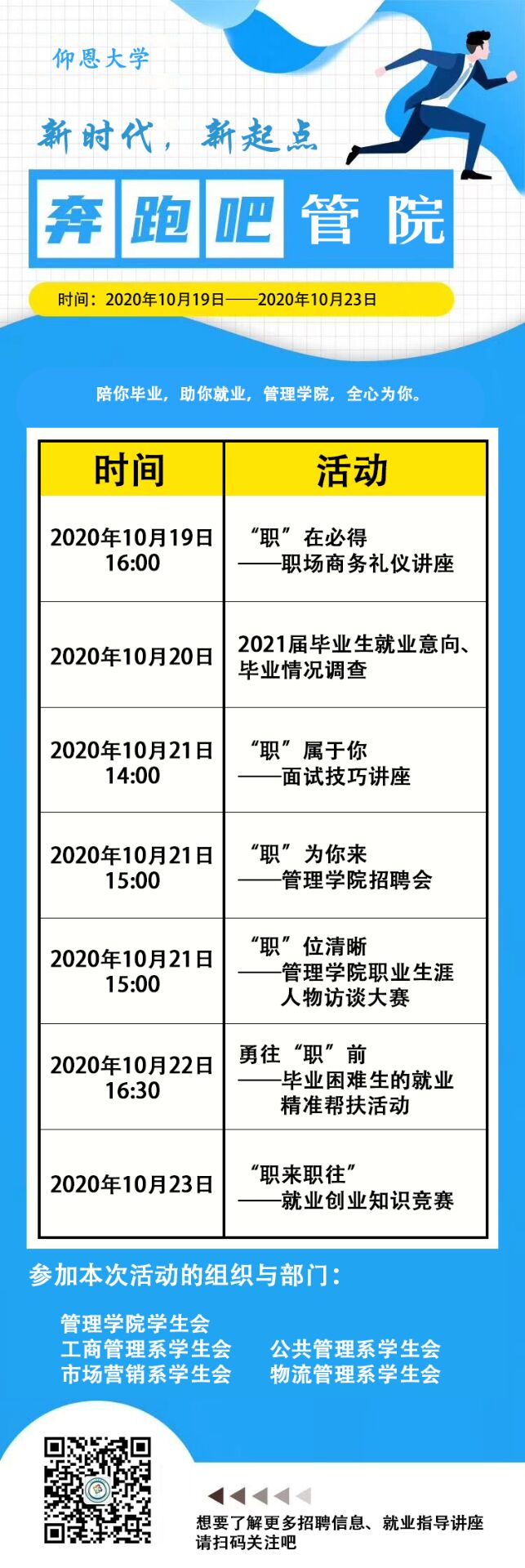 宣传海报 “就业服务周”系列活动以七个主题活动为依托,通过职场商务礼仪讲座、2021届毕业生就业意向和毕业情况调查、面试技巧讲座、校园招聘会、职业生涯人物访谈大赛、毕业困难生的就业精准帮扶活动以及就业创业知识竞赛等形式,以此向学院2021届毕业生传达最前沿的就业信息及动向。