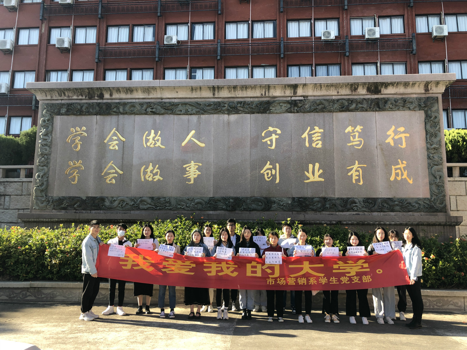 此次活动,市场营销系学生党支部全体党员环校一圈,在各个地方拉横幅,集体打卡拍照,大家先在纸上写一段表白学校的话,然后一起和学校的建筑物拍个照片,拍照发朋友圈。并且支部成员集体宣誓,遵守校纪校规,认真完成学业。
