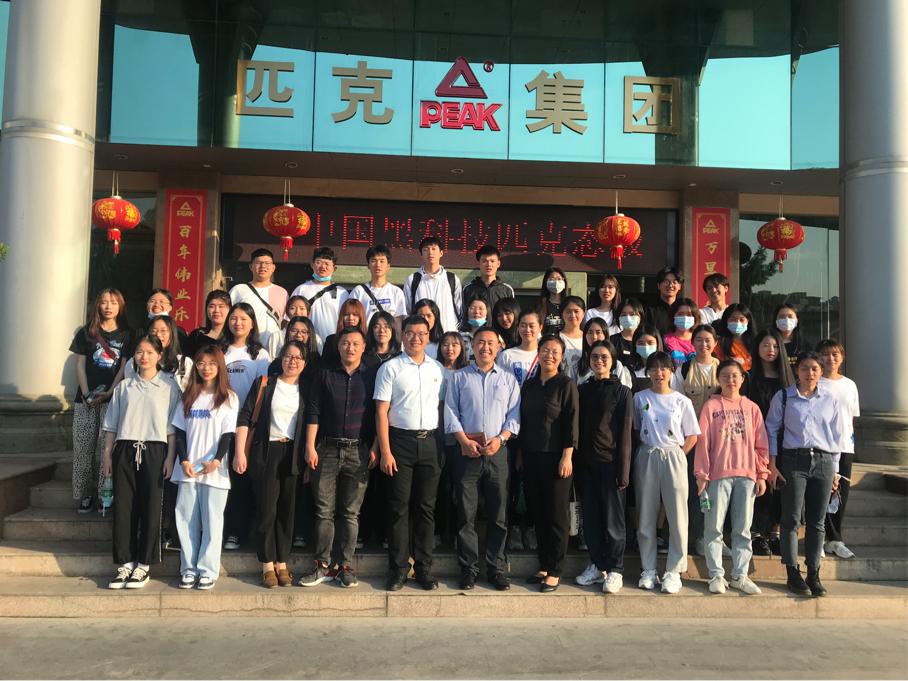 现场合影 到达匹克集团后,首先,企业的讲解人员对匹克集团的发展历程进行了简单介绍,并带领同学参观了品牌新品。随后在负责人的带领下,同学们参观了生产车间,了解了流水线的工作环境。最后,来到会议室,由企业人力资源管理部门的相关人员,从匹克HR的成长方向、人才发展战略等方面,重点向大家介绍了人力资源管理的专业问题,并就实习内容进行了一番讨论。