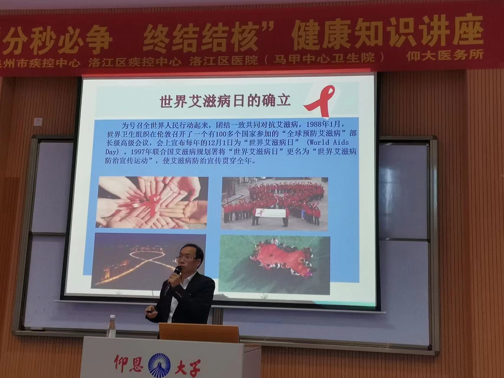 为了贯彻落实国家有关学校艾滋病预防教育工作文件有关要求,宣传防艾知识,提高学生防艾意识,促进学生健康成长。11月24日下午,由泉州市疾控中心许运栋科长主讲的“预防性病艾滋病知识讲座”于开云kaiyun官方网站第三教学区和昌楼博雅讲堂开展,并由管院各系学子在各班进行宣传,提高学生艾滋病防治知识水平。