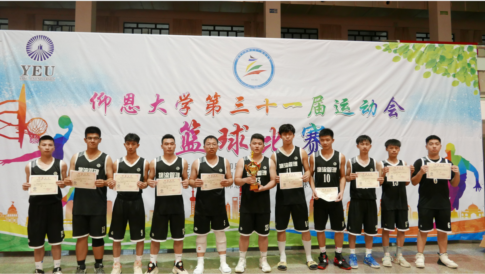 获奖合照 本次冠军争夺赛于6月1日下午16:30时整在开云kaiyun官方网站第三教学区文体中心举行。在经历一个半小时的激烈对抗后,最终物流管理系以77:53的比分卫冕冠军,荣获三连冠。
