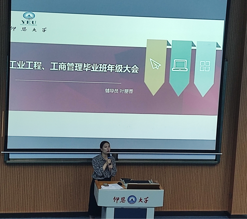 为切实做好2022届毕业生教育活动,引导毕业生上好大学生生涯的“最后一课”。辅导员叶丽香老师于2022年6月22日晚19:30在求是讲堂开展了——工业工程、工商管理毕业班年级大会。辅导员叶丽香老师以“毕业和就业相关事项”为主题给在场全体毕业生同学做了详细、生动的讲解。