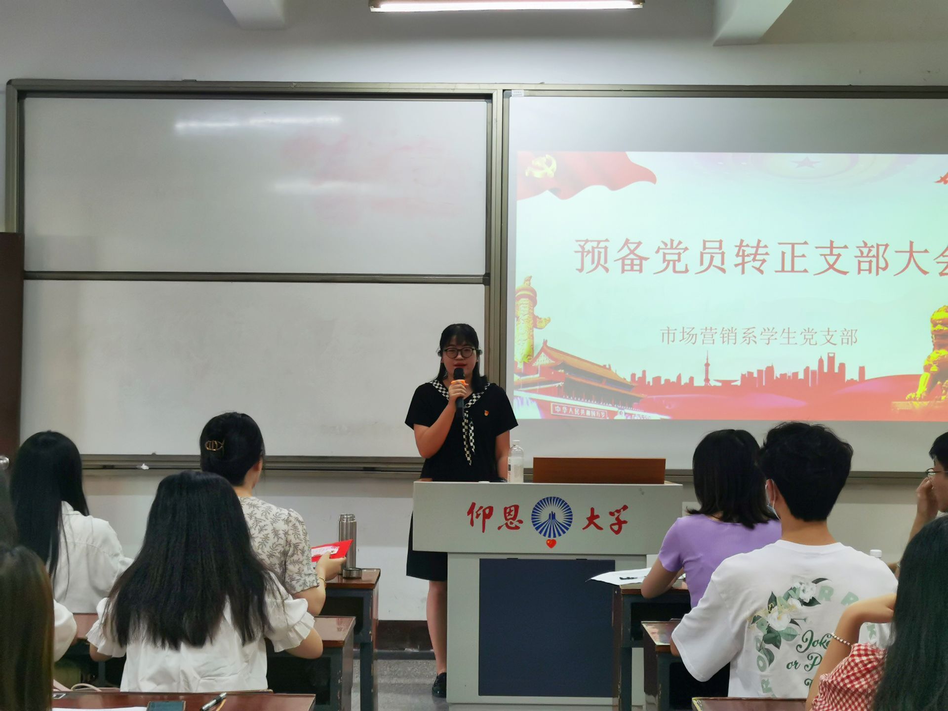 6月23日下午,市场营销学生党支部在共和楼219教室召开预备党员转正大会,本次大会由市场营销系学生党支部温晓霞同志主持,全体党员及预备党员同志的群众代表参加本次会议。