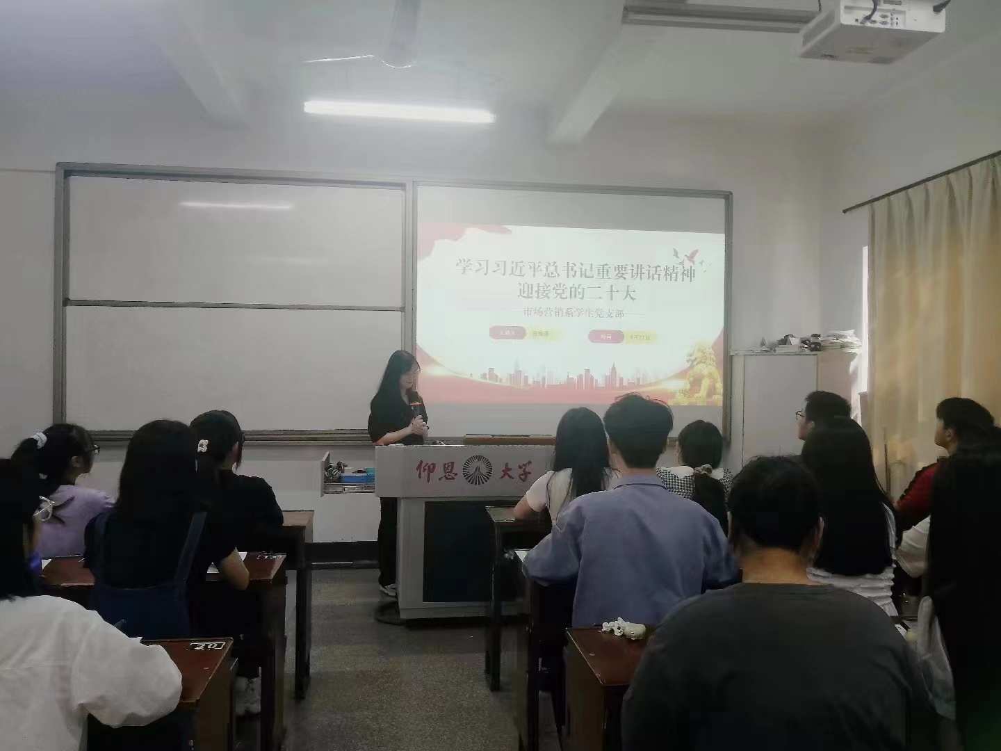 9月21日下午,市场营销系学生党支部于共和楼218教室开展“学习习近平总书记重要讲话精神迎接党的二十大”党课学习活动,本次活动由陈桂清同志主讲,全体党员参加。