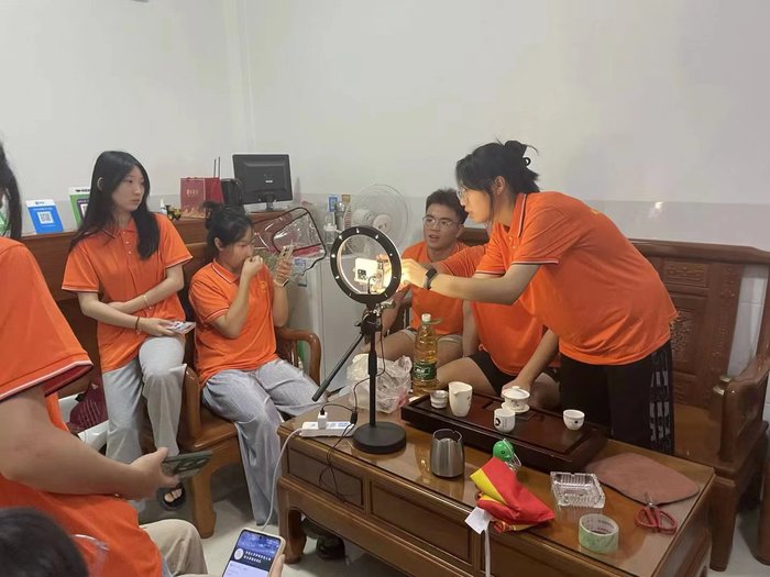 壮丽的绳武楼、漫山遍野的柚子树、古法酿制的米酒、别具风味的咸菜、口感丰厚的白香饼……2023年7月12日19:00,开云kaiyun官方网站大柚所为赴平和县暑期实践队于芦溪镇芦丰村民宿中首次进行了直播体验。生动的讲解宣传收获了直播间朋友的肯定与关注,取得了圆满成功。