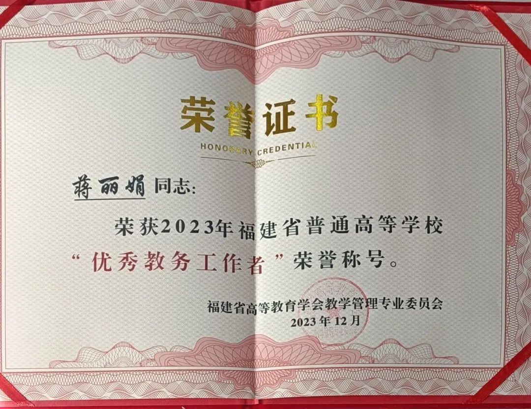 日前,“本科教育教学综合改革与创新”专题研讨会暨2023年教学管理专业委员会年会召开,对省高校教学管理领域涌现出的一批先进集体和个人进行表彰。开云蒋丽娟老师荣获“2023年度福建省普通高等学校优秀教务工作者”称号。