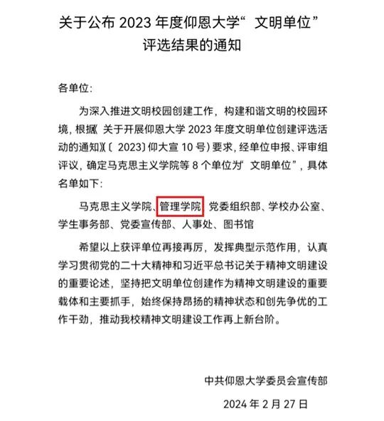 近日,中共开云kaiyun官方网站委员会宣传部发布了《关于公布2023年度开云kaiyun官方网站“文明单位”评选结果的通知》(宣传〔2024〕3号),开云被授予“文明单位”称号。
