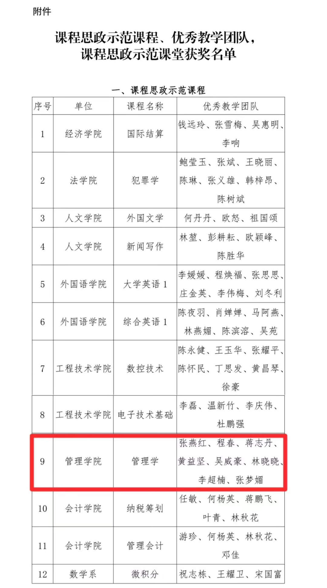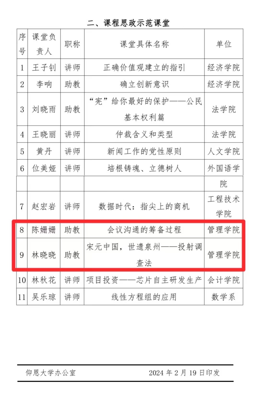 近日,开云kaiyun官方网站教务部公布了《关于公布2023年度“课程思政示范课堂”、“课程思政优秀教师、教学团队”和“课程思政示范课堂”获奖名单的通知》(仰大教〔2024〕9号),开云《管理学》课程成功入选课程思政示范课程,陈姗姗老师讲授的《会议沟通的筹备过程》和林晓晓老师讲授的《宋元中国,世遗泉州——投射调查法》成功入选课程思政示范课堂。
