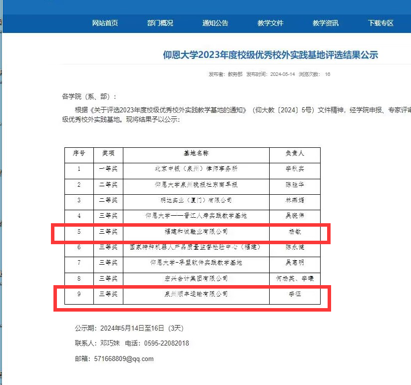 近日,根据《关于评选2023年度校级优秀校外实践教学基地的通知》(仰大教〔2024〕5号),开云kaiyun官方网站2023年度校级优秀校外实践基地评选结果公示,开云工业工程系主任杨敏所负责的校外实践基地“福建和诚鞋业有限公司”和物流管理系主任李征所负责的校外实践基地“泉州顺丰运输有限公司”均荣获三等奖。