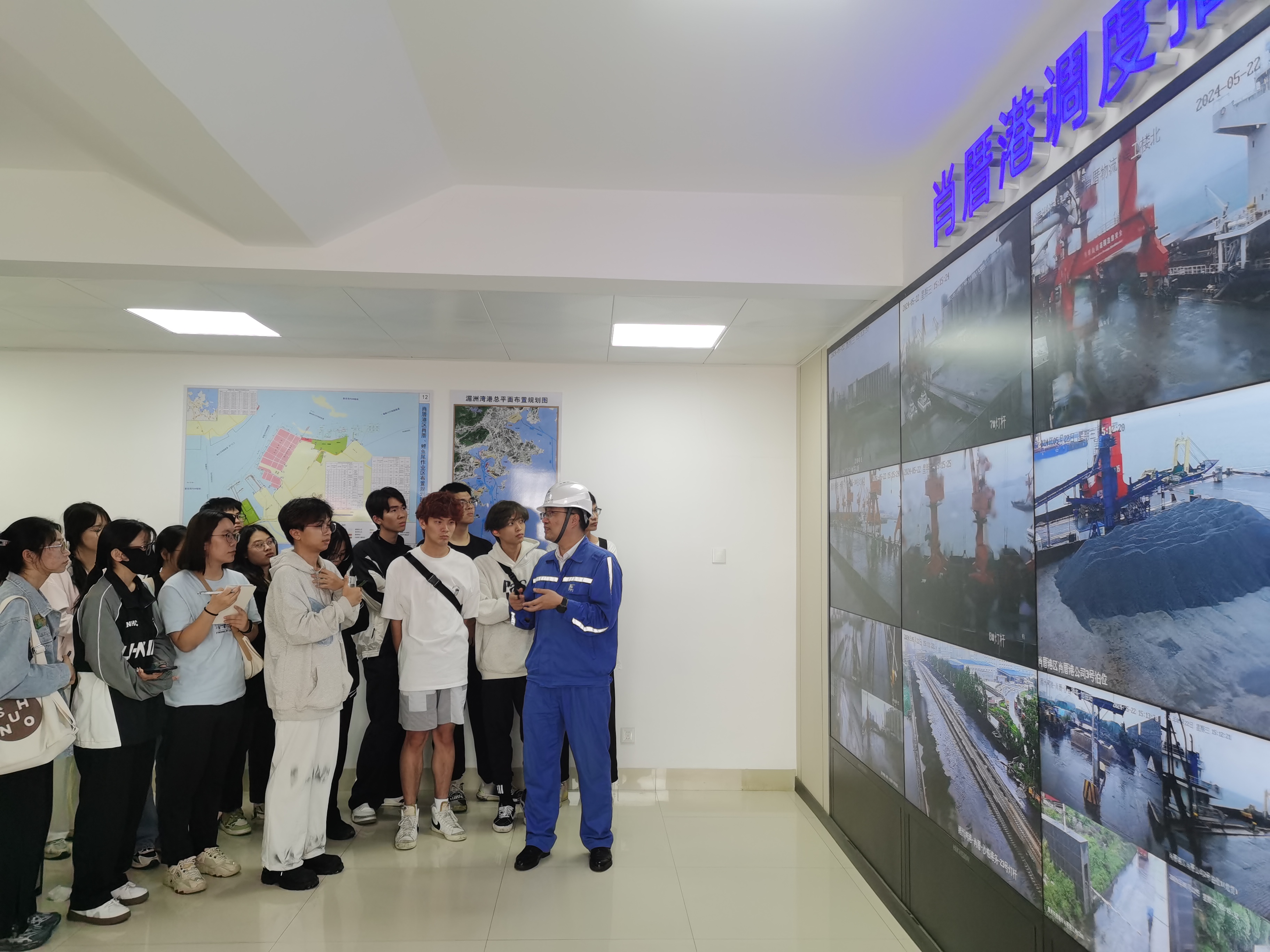 同学们首先在泉州港务集团肖厝公司办公室郭安然主任的带领下,来到肖厝港码头现场进行实地调研,听取操作部刘峰南主任关于港口船舶货物装卸作业流程的详细介绍,并参观了港口堆场及生产调度指挥中心。