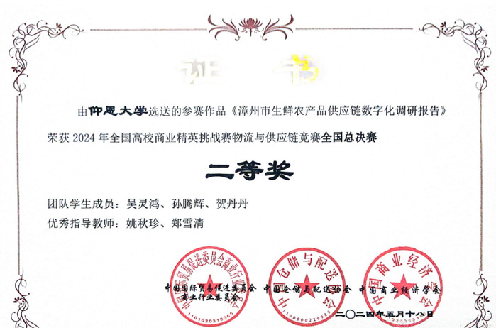 2024年5月18日,2024年全国高校商业精英挑战赛物流与供应链总决赛落下帷幕。由物流管理系教师指导的两支团队在此次竞赛中获得佳绩。其中,螺蛳粉大队(学生成员:蔡林涛、姚娴、王丹玲)的作品《螺蛳粉供应链竞争力评价研究》在此次比赛中荣获二等奖。星星之火队(学生成员:吴灵鸿、孙腾辉、贺丹丹)的作品《Y漳州市生鲜农产品供应链数字化调研报告》在此次比赛中荣获二等奖。