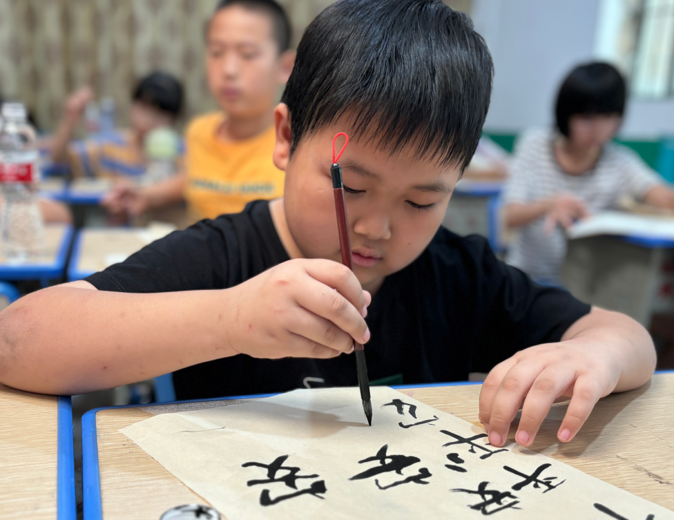 笔走龙蛇书韵长,墨香四溢满课堂。书法,作为中华民族传统文化的瑰宝,承载着千年的智慧与艺术精髓。课堂伊始,实践队队员为孩子们讲解了字体的演变历史,从秦篆到战隶,汉草,行书,再到楷书,字体的演变来源于社会发展的需要,孩子们在字体演变历史的学习中感悟到中华民族的智慧和内涵。随后,实践队队员示范了软笔书法的笔法和写法,包括笔画、结构、布局等方面的内容,孩子们体验了毛笔的开笔、润笔,并学写毛笔字。此次课堂,孩子们进行了一场与中华传统文化的深度对话,每一个笔画,都倾注着孩子们的专注与用心,每一个汉字,都凝聚着孩子们对书法艺术的敬意与追求。