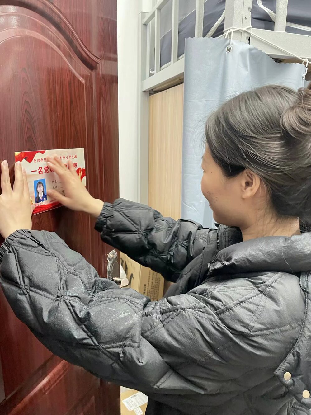 仪式上,苏婷同志就如何充分发挥好表率引领作用提出要勇作表率,积极为群众办好事,办实事,端正自身态度,虚心接受他人建议等做法。授牌仪式中,学生党员纷纷表示:党员宿舍挂牌不仅仅是一项荣誉,更是一份责任,力争在以后的学习生活中做到“一名党员,一面旗帜”。授牌后,连景霞书记作总结发言,她指出学生党员是建设文明宿舍的中坚力量,要以身作则,带领身边同学们建设美好的宿舍环境。仪式后,市场营销系学生党支部全体党员分别回到各自宿舍进行挂牌。本次党员宿舍挂牌活动覆盖学院17名学生党员、16间党员宿舍。