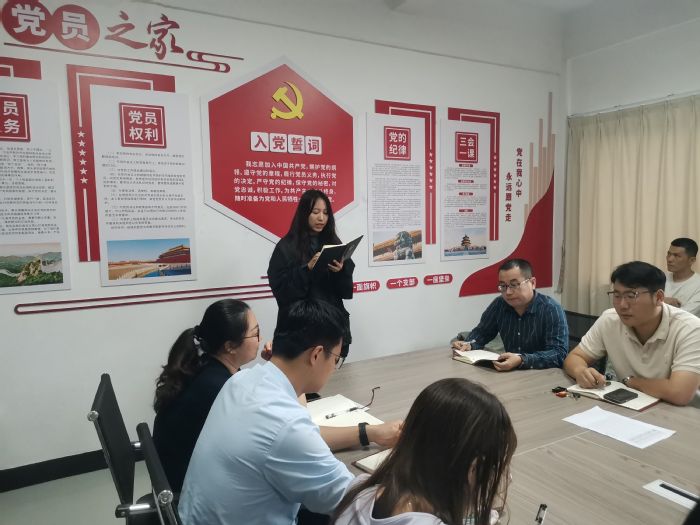 在庄严的仪式环节,支部书记程春同志为赵明同志佩戴党徽,并带领全体党员重温入党誓词。铮铮誓言回荡在会场,表达了全体党员对党的无限忠诚和为共产主义事业奋斗终身的坚定信念。