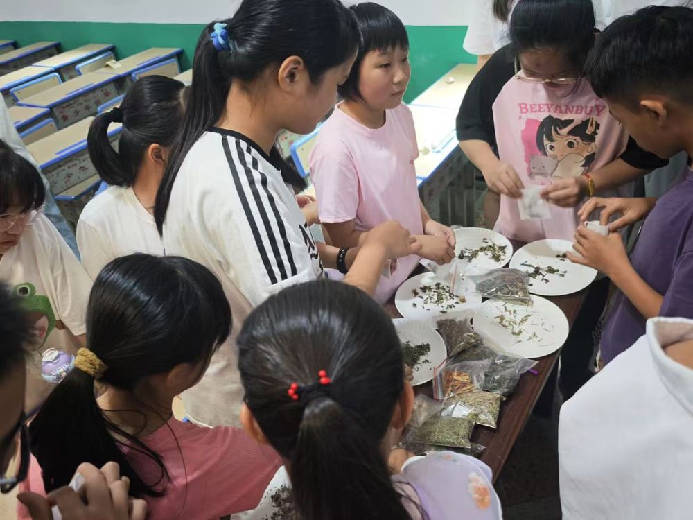 探秘本草寻瑰宝,巧手制囊传匠心。队员沈如钰通过生动案例讲述中药现代化发展成就——从屠呦呦青蒿素的科学突破,到中医药在抗疫中的卓越贡献,展现传统医学与现代科技交融的魅力,点燃孩子们对中药神奇功效的探索热情。14味形态各异的中药材陈列桌前,紫苏的辛香、艾叶的清苦、薄荷的沁凉依次唤醒感官。孩子们俯身轻嗅,仔细端详,在视觉与嗅觉的双重体验中,认识了兼具药效与诗意的“自然馈赠”。
