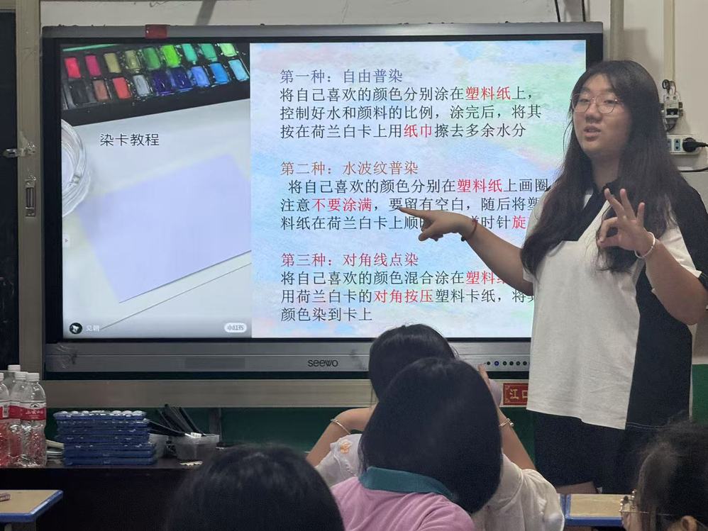 一张卡纸,几滴颜料,晕染的是艺术之美,传递的是薪火温情。实践队以染卡为桥,让孩子们在动手实践中感受创造的乐趣,更在笔墨间种下对未来的向往。
