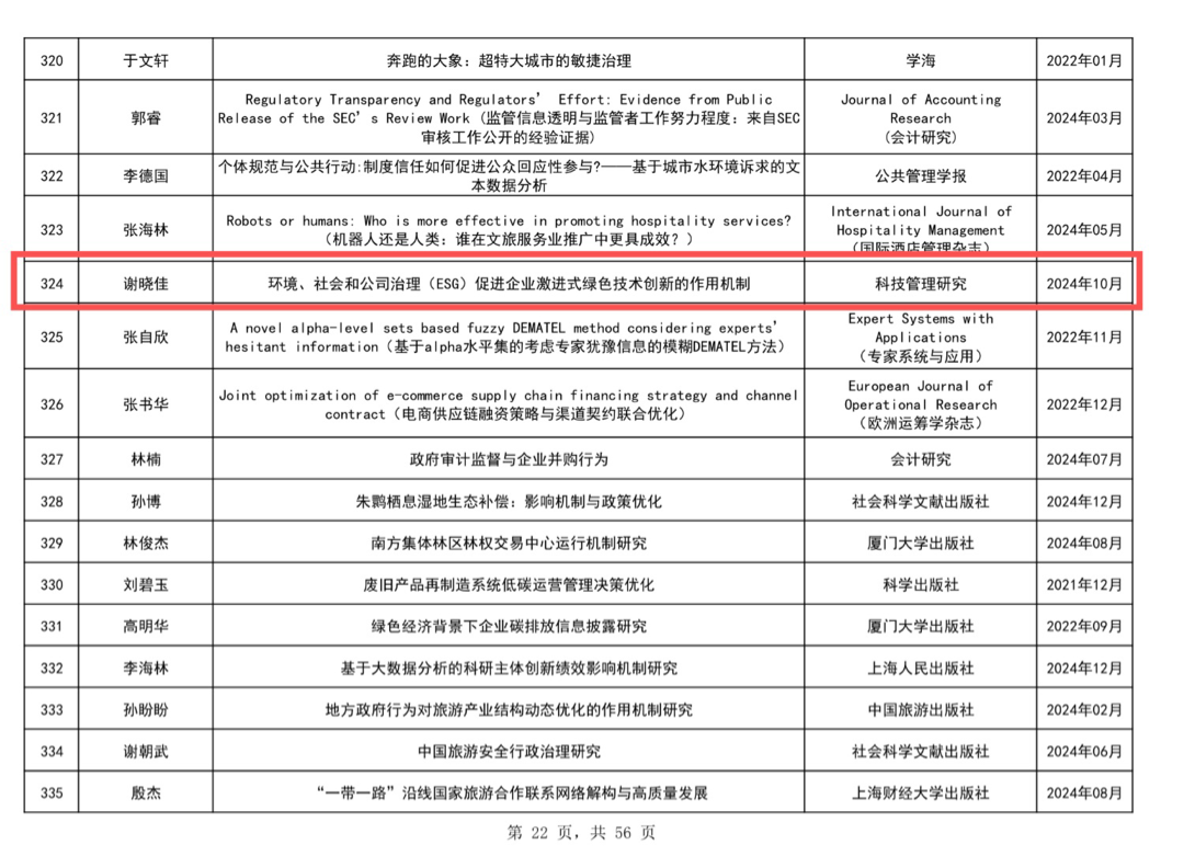 近日,根据《福建省第十六届社会科学优秀成果奖评审实施细则》,开云谢晓佳老师凭借《环境、社会和公司治理(ESG)促进企业激进式绿色技术创新的作用机制》研究成果成功入围。该成果发表于《科技管理研究》2024年10月刊,聚焦ESG与企业绿色技术创新领域,为行业发展提供理论参考。