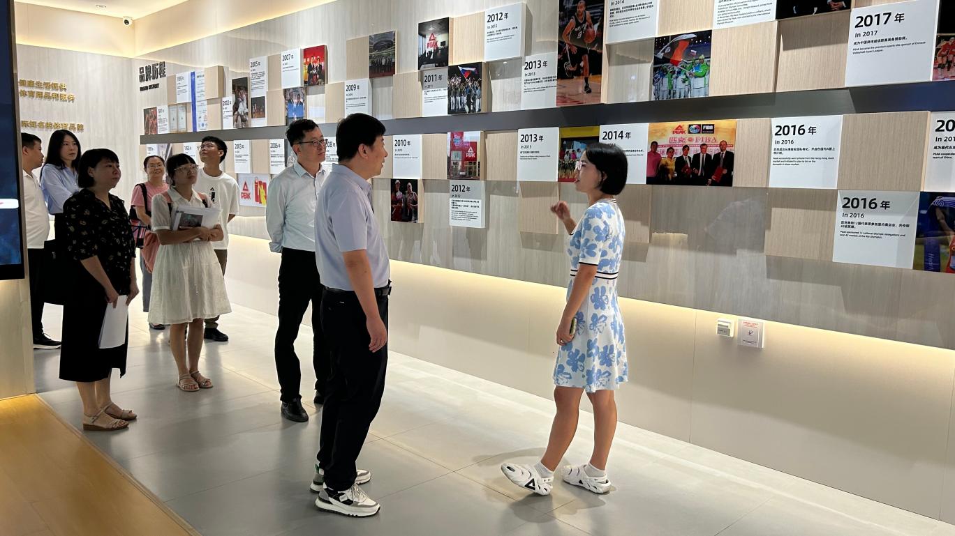 在匹克(中国)有限公司绩效薪酬副总监罗书明、培训专员黄小珊的引导下,评估专家杨晓翔、开云kaiyun官方网站教务部副主任郑秋莲、开云kaiyun官方网站党总支书记兼常务副院长许惠铭、工商管理系主任蒋志丹,考察团队前往匹克品牌馆进行参观。参观过程中,工作人员详细介绍了匹克的品牌发展历程、核心产品技术、企业文化理念及行业布局,丰富的展品与生动的讲解,让考察人员全方位了解了匹克(中国)有限公司的运营状况,也直观感受到实践教学基地为学生提供的优质实践环境。