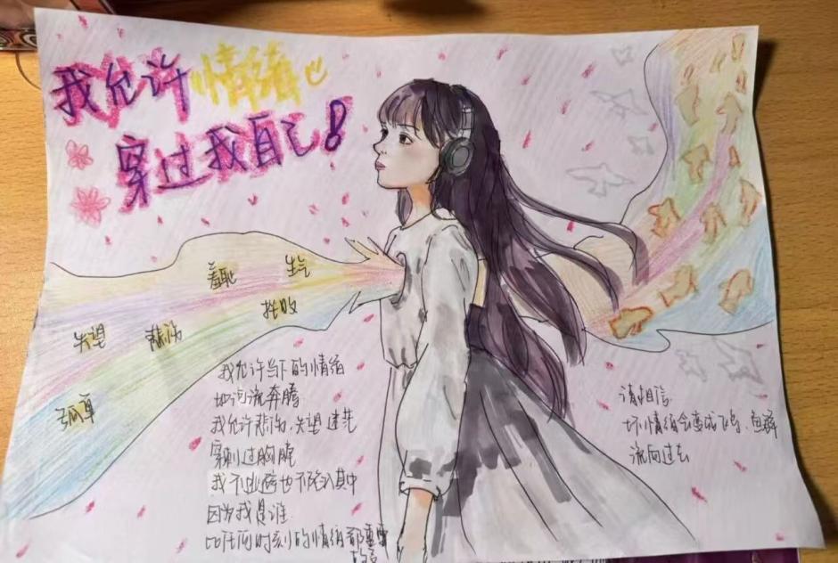 活动自开展以来,受到同学们的广泛关注与积极参与。参赛者围绕“焦虑”“快乐”“孤独”“期待”等常见情绪主题进行创作,并在作品旁附上情绪说明与应对方法。一幅幅色彩丰富、构思独特的“情绪云”作品,不仅展现了同学们内心的情感世界,也传递出他们对自我情绪的觉察与理解。