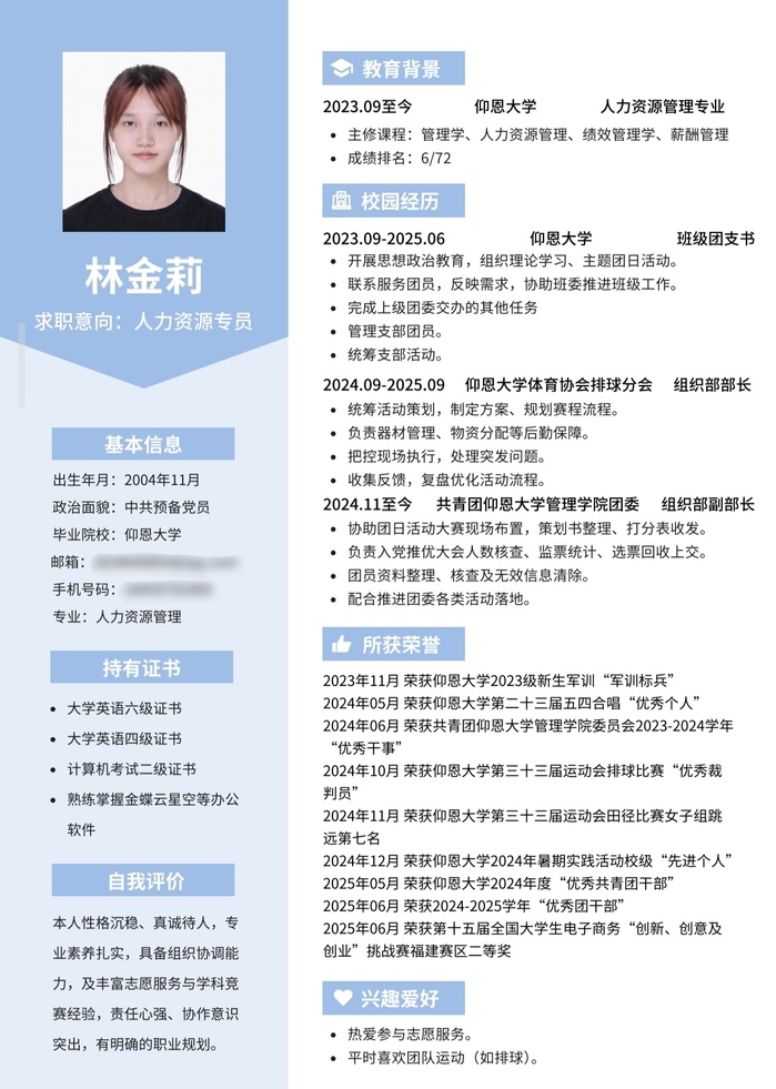 评审环节邀请人力资源系专业教师组成评审团,围绕简历结构完整性、内容针对性、语言简洁度、设计美观度等维度进行综合打分,且同时开设线上投票环节,邀请师生共同参与评选。获奖作品不仅呈现学业成果、实践经历,又融入个性化职业认知,充分展现管院学子的职场潜力。最终,李芯玲同学荣获一等奖,林金莉、蔡晓敏、吴怡帆同学获得二等奖,林佳欣、林嘉希、林震菲、林琪琪、邓凌楠获得三等奖,王倩雯、林嘉怡、孙昌锋获得优秀奖。