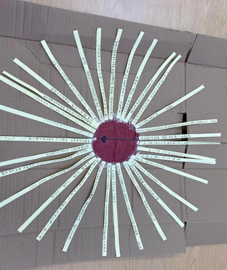 温暖寄语太阳环节以集体共创的形式开展,同学们在黄色纸条上写下对艾滋病感染者的祝福,将写好的纸条贴在展板预留的光芒区域,跳出旁观者视角,主动写下对艾滋病病毒感染者的善意与尊重——无论是“愿你被世界温柔以待”的温暖祝福,还是“我们本就该平等同行”的反歧视宣言,都体现了同学们从认知转向共情,意识到感染者是需要支持的个体,而非需要隔离的标签,弱化偏见、强化包容意识。