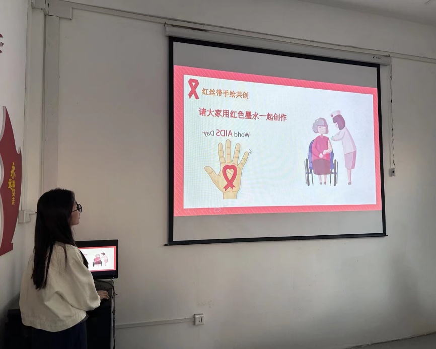 红丝带手绘共创环节介绍了红丝带“关怀感染者、支持防艾”的象征意义,同学们用空白纸张与红色颜料,自由手绘红丝带,最终形成的红丝带墙进一步强化了青年群体主动了解、积极参与、共同推动防艾工作的责任感。