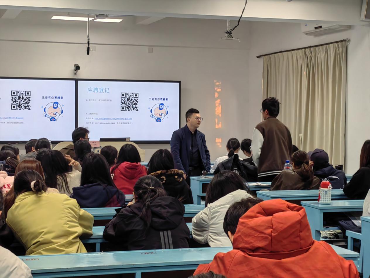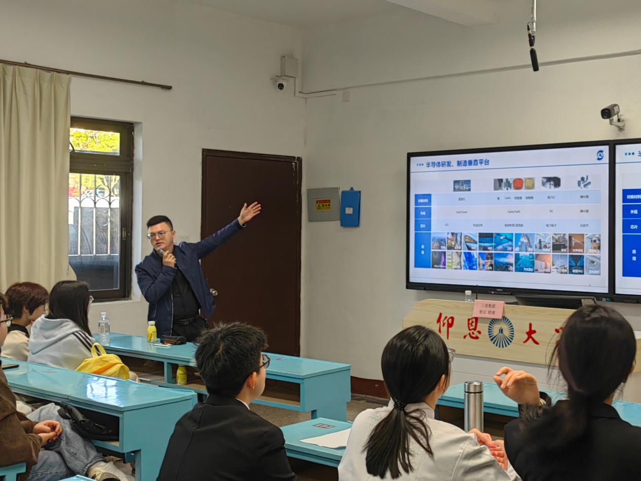 为精准对接半导体行业人才需求,搭建校企协同育人桥梁,助力应届毕业生明确职业方向、实现高质量就业,12月15日下午16时,三安集团经理张云受邀在开云kaiyun官方网站第一教学区共和楼203教室开展专场宣讲招聘会,22级与23级工业工程专业师生共同到场参与。