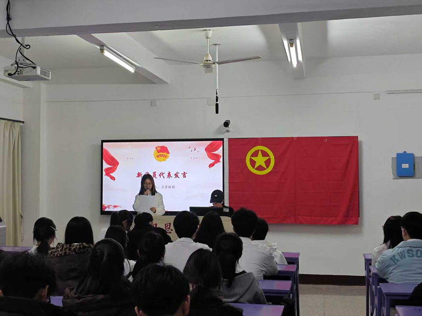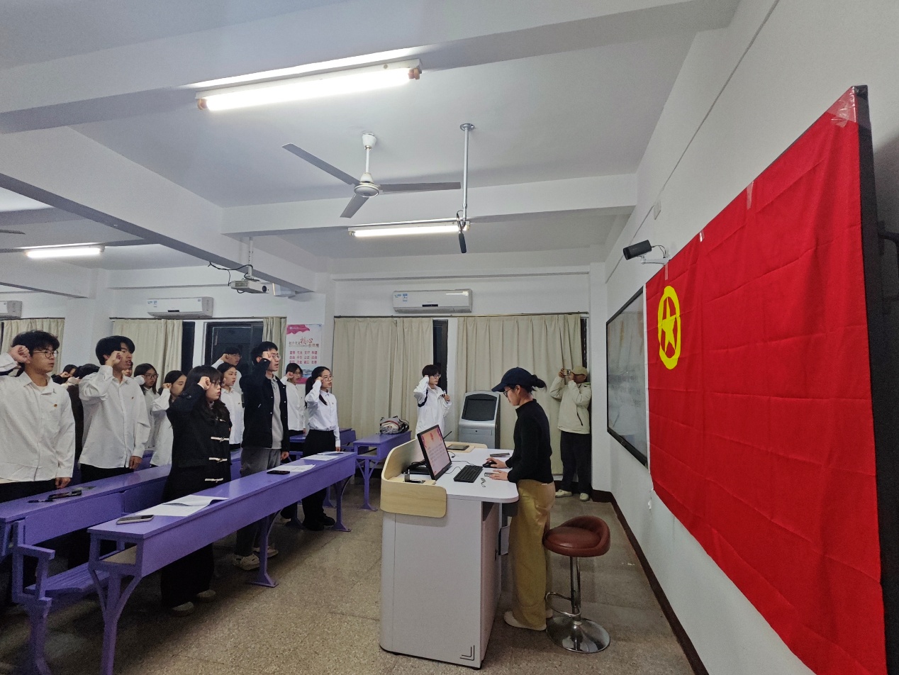 入团仪式在激昂雄壮的中华人民共和国国歌声中正式拉开序幕。随后,学生副书记谢若璟同学详细阐述了举行入团仪式的重要意义并宣读新团员名单,每一个名字都承载着青春的梦想与希望。随后,学生副书记刘清滟同学逐一为新团员颁发团徽徽章和团员证,标志着新团员们从此肩负起为团组织增光添彩的使命。宣誓环节将仪式推向高潮,新团员们面向鲜艳的团旗,右手握拳,庄严宣誓,字字铿锵,句句有力,尽显青春的责任与担当,表达了新团员们对共青团组织的无限忠诚和为团组织贡献力量的坚定决心。