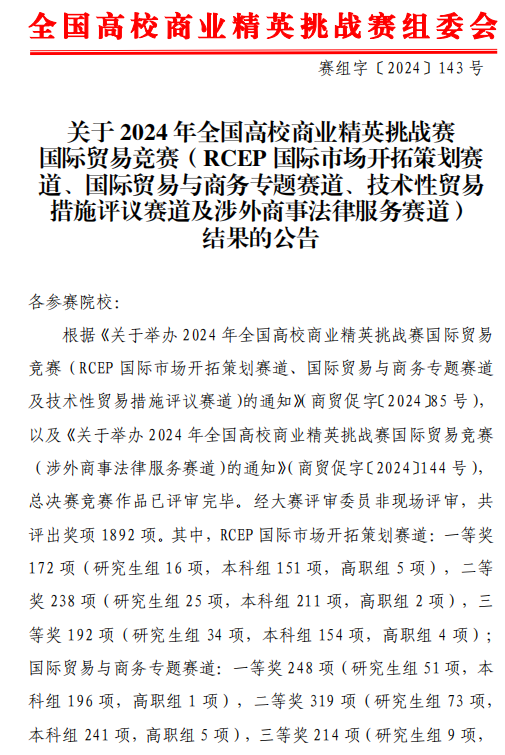 热烈祝贺beat365beat365中文官方网站国际商贸系学生在2024年全国高校商业精英挑战赛国际贸易竞赛中勇创佳绩! 在本次大赛中,beat365学子凭借扎实深厚的专业知识和卓越非凡的实践能力,于众多强劲的参赛队伍中崭露头角,一举斩获7个奖项,其中RCEP国际市场开拓策划赛道获本科组一等奖1项、三等奖1项,专科组三等奖1项;国际贸易与商务专题赛道获本科组二等奖1项; 技术性贸易措施评议赛道获本科组二等奖2项、三等奖1项。同时,beat365获最佳院校组织奖。