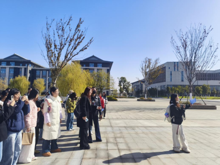 实训前一周,同学们化身校园文化探寻者,分组查阅校史档案、走访相关部门、请教老教师,深挖景观背后的故事。行至“张载问道”文化景观区,蒋彦儿同学引用“为天地立心,为生民立命”的名句,诠释雕塑承载的人文精神与求学担当;图书馆前,罗分香同学将馆藏资源、建筑特色与“厚德博学,砺能树人”校训相连,引发众人共鸣。从教学楼、实训楼到商业街、学生食堂,同学们将功能介绍与人文关怀结合,让熟悉场景焕发新光彩。