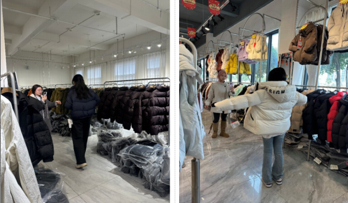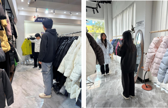 活动首站,同学们走进共青城羽绒博览中心现场。大家系统了解羽绒原料分级、服装设计研发、跨境出口标准等产业细节,重点观摩了具备防风锁温技术的高端羽绒产品,以及针对欧洲、东南亚等不同海外市场的定制化款式,直观感受到“中国羽绒之乡”的产业实力与外贸竞争力。