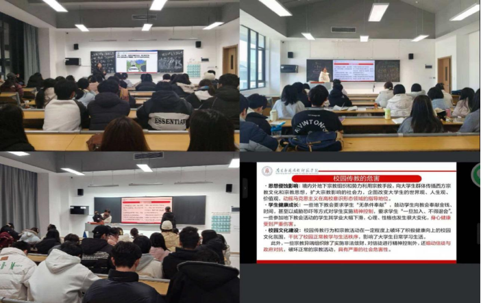 班会上,辅导员们以 “知政策、明底线、防渗透” 为核心,从民族工作主题、新时代党的民族工作主线切入,系统讲解了我国平等、团结、互助的社会主义新型民族关系,以及民族区域自治等重要民族政策,引导学生深刻认识铸牢中华民族共同体意识的重要意义。在宗教政策解读环节,辅导员们重点强调了 “教育与宗教相分离” 的基本原则,详细解读了 “两个不得”“五个严禁” 等校园宗教工作核心要求,结合非法宗教活动的具体表现形式与法律后果,让学生明确行为边界。针对如何防范校园非法传教,辅导员们给出明确指引,鼓励学生遇到非法传教行为时坚决说 “不”,拒绝留存联系方式,及时向辅导员和学校报告,共同筑牢校园安全防线。宣讲过程中,同学们围绕政策疑问、实际防范场景等积极提问,辅导员们耐心细致逐一回应,现场互动氛围热烈。