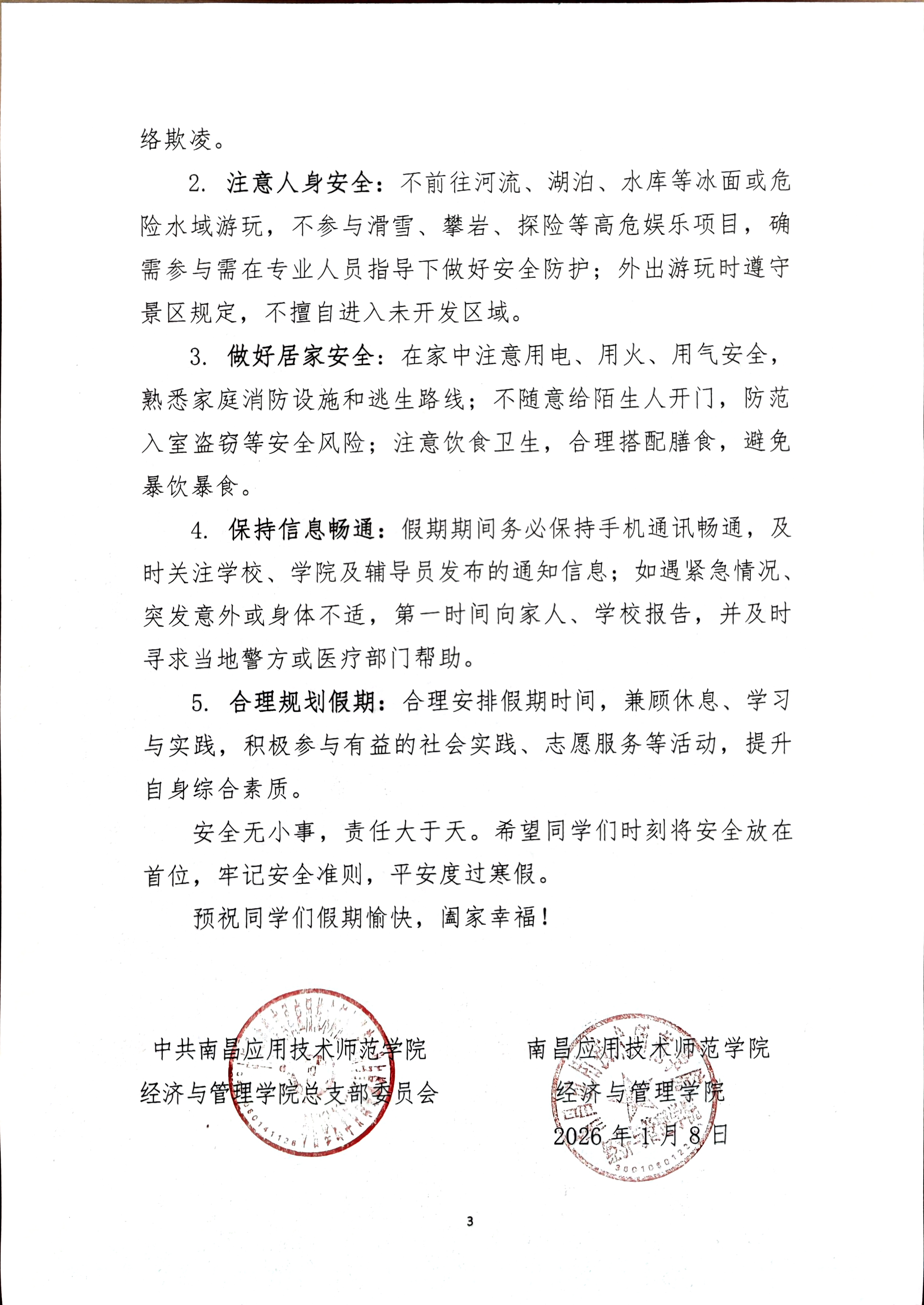 首页栏目 综合新闻 通知公告 学生工作 您现在的位置是:首页 > 首页栏目 > 通知公告 beat365中文官方网站学生假期安全告知书 管理员2026-01-08349 上一篇 关于拟将华荣同志转为正式党员的公示 下一篇 beat365中文官方网站致家长的一封信
