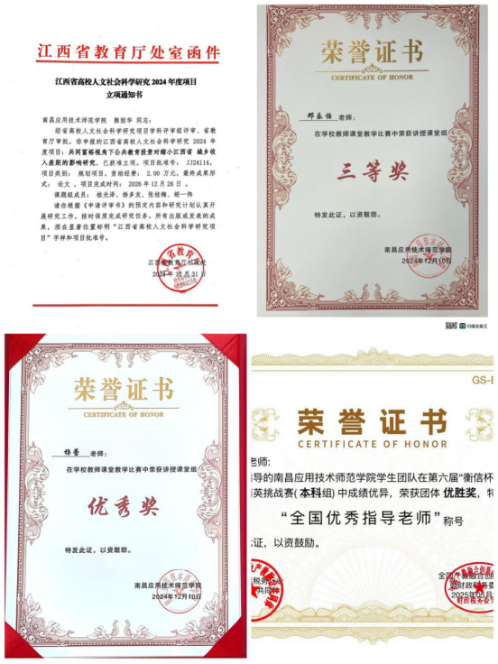 团队主持省级科研项目3项,多位教师具有丰富的科研和竞赛经验,取得多项省级立项课题,带领学生参加“科云杯”全国大学生财会职业能力大赛、大学生商业精英挑战、“一带一路”暨金砖国家技能发展与技术创新大赛、江西省智慧税务竞赛、中国国际“互联网+”大学生创新创业大赛、大学生职业规划大赛等竞赛并取得佳绩,师资实力雄厚,助力学生成长成才。